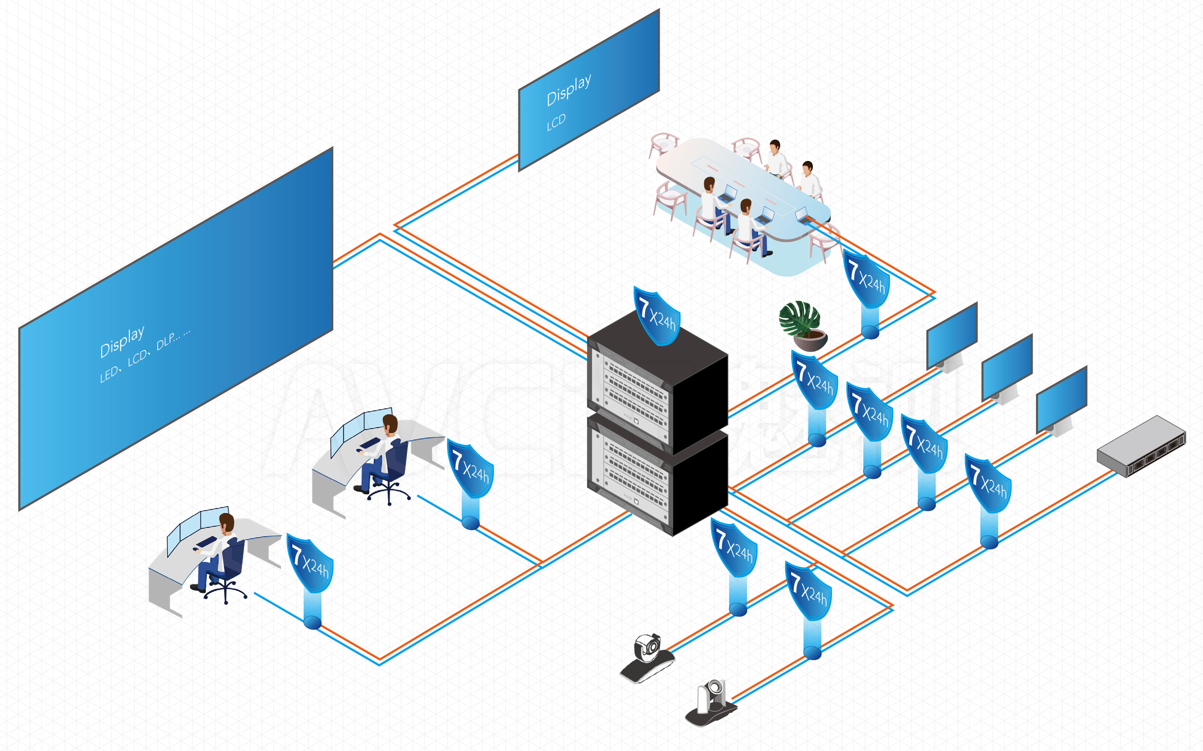 Phinx純光纖系統(tǒng)配置完全無(wú)感的雙冗余備份,確保365×24小時(shí)不間斷穩(wěn)定運(yùn)行。任一位置故障均可自動(dòng)檢測(cè),自動(dòng)切換至備用鏈路,切換過(guò)程視頻無(wú)黑屏閃屏,音頻無(wú)任何停頓或者雜音,完全無(wú)感切換到備用線路。