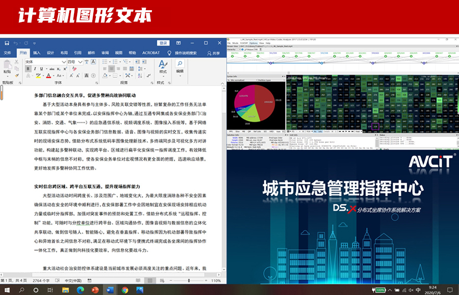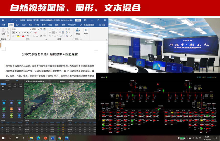 在專業(yè)視聽(tīng)領(lǐng)域,尤其是顯示控制和坐席控制領(lǐng)域,在各種指揮/調(diào)度中心、監(jiān)控中心、數(shù)據(jù)中心、會(huì)議室等場(chǎng)所中,人們所使用的視頻圖像大約80%以上都來(lái)自于計(jì)算機(jī)等各種電子設(shè)備,這些視頻圖像通常由各種應(yīng)用軟件生成,圖像由文本、圖形、自然圖像以及計(jì)算機(jī)生成的動(dòng)畫(huà)等混合而成,這類視頻圖像,統(tǒng)稱為計(jì)算機(jī)屏幕內(nèi)容。如下圖所示: