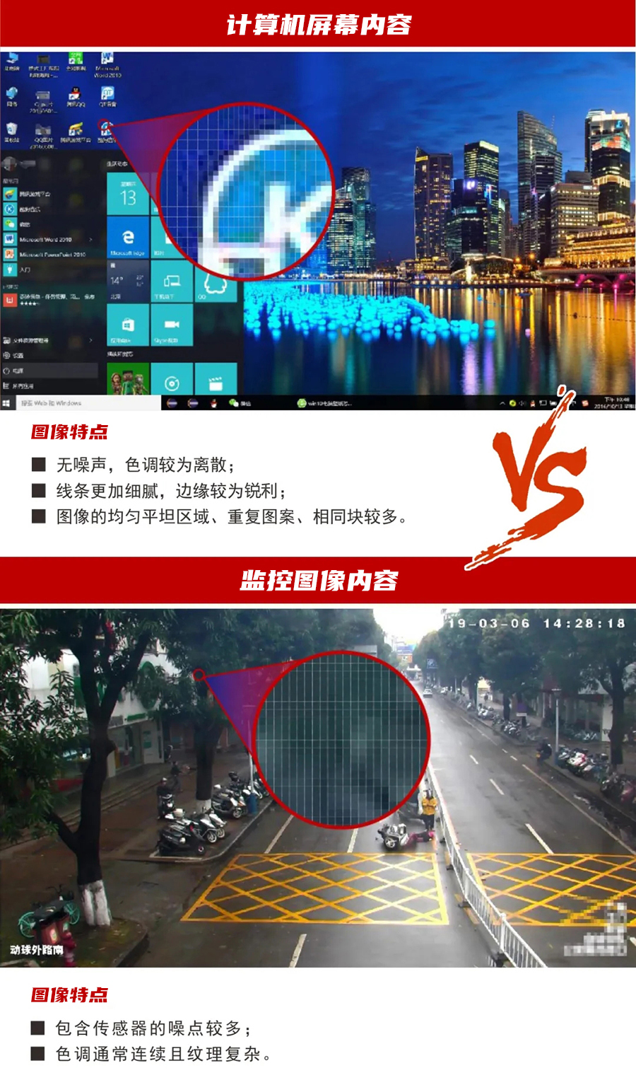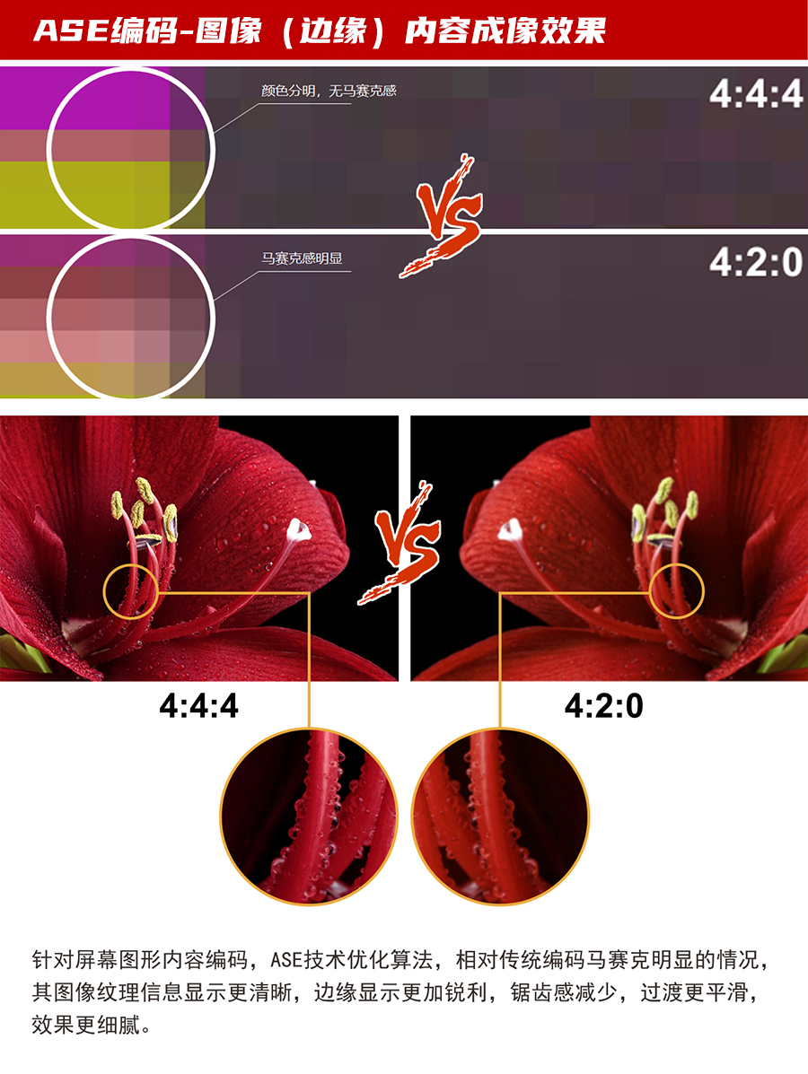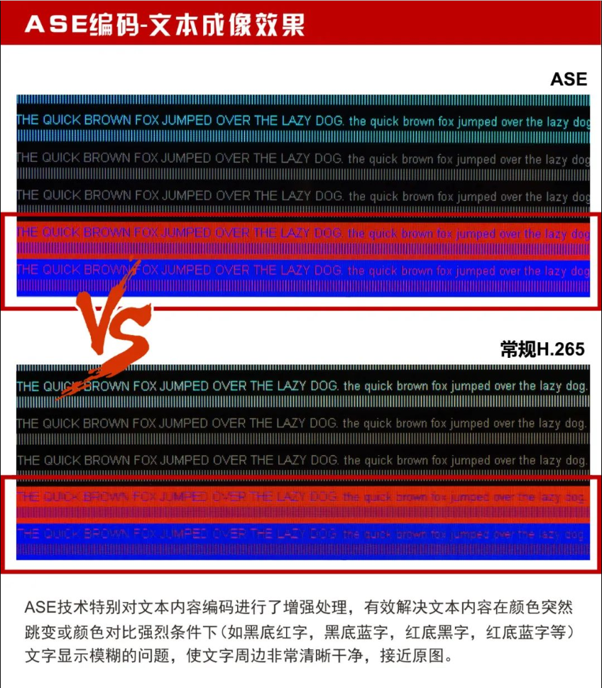 ▲ ASE技術(shù)特別對(duì)文本內(nèi)容編碼進(jìn)行了增強(qiáng)處理,有效解決文本內(nèi)容在顏色突然跳變或顏色對(duì)比強(qiáng)烈條件下(如黑底紅字,黑底藍(lán)字,紅底黑字,紅底藍(lán)字等)文字顯示模糊的問(wèn)題,使文字周邊非常清晰干凈,接近原圖。