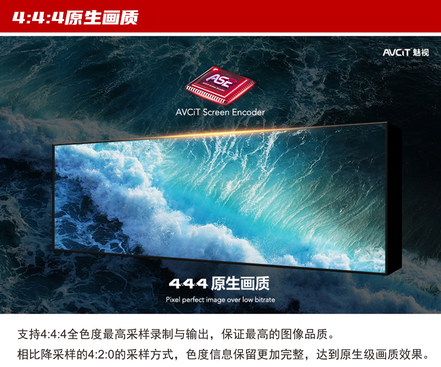 鑒于計(jì)算機(jī)屏幕內(nèi)容圖像與安防監(jiān)控視頻內(nèi)容具有顯著不同的特點(diǎn),同時(shí)為了應(yīng)對(duì)分布式系統(tǒng)在指揮調(diào)度中心等諸多應(yīng)用中愈加迫切的屏幕內(nèi)容圖像/視頻的編碼需求,AVCiT魅視通過(guò)自主研發(fā)的計(jì)算機(jī)屏幕編碼技術(shù)(avcit screen encoder,簡(jiǎn)稱 “ASE”),針對(duì)H.265的編碼進(jìn)行圖像增強(qiáng)處理,以達(dá)到4:4:4原生畫(huà)質(zhì)顯示效果。