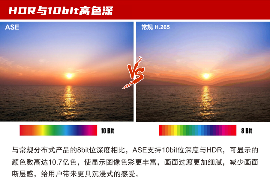 ▲ 與常規(guī)分布式產(chǎn)品的 8bit 位深度相比,ASE支持 10bit 位深度與HDR,可顯示的顏色數(shù)高達(dá)10.7億色,使顯示圖像色彩更加豐富,畫(huà)面過(guò)渡更加細(xì)膩,減少畫(huà)面斷層感,給用戶帶來(lái)更具沉浸式的感受。
