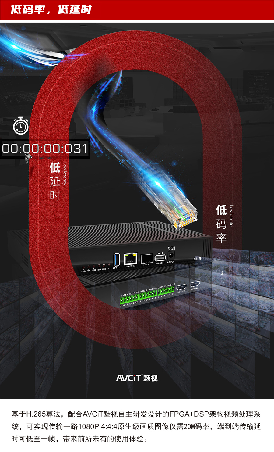 ▲ 基于H.265算法,配合AVCiT魅視自主研發(fā)設(shè)計(jì)的 FPGA+DSP 架構(gòu)視頻處理系統(tǒng),可實(shí)現(xiàn)傳輸一路1080P 4:4:4原生級(jí)畫(huà)質(zhì)圖像僅需 20M碼率,端到端傳輸延時(shí)可低至一幀,帶來(lái)前所未有的使用體驗(yàn)。