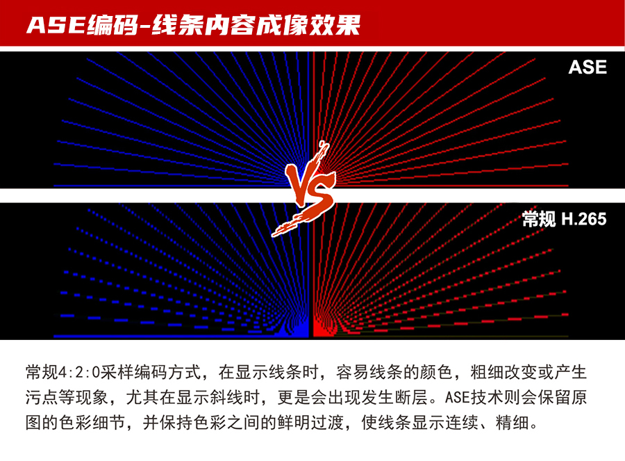 ▲ 常規(guī)4:2:0采樣編碼方式,在顯示線條時(shí),容易線條的顏色粗細(xì)改變或產(chǎn)生污點(diǎn)等現(xiàn)象,尤其在顯示斜線時(shí),更是會(huì)出現(xiàn)發(fā)生斷層。ASE技術(shù)則會(huì)保留原圖的色彩細(xì)節(jié),并保持色彩之間的鮮明過(guò)渡,使線條顯示連續(xù)、精細(xì)。