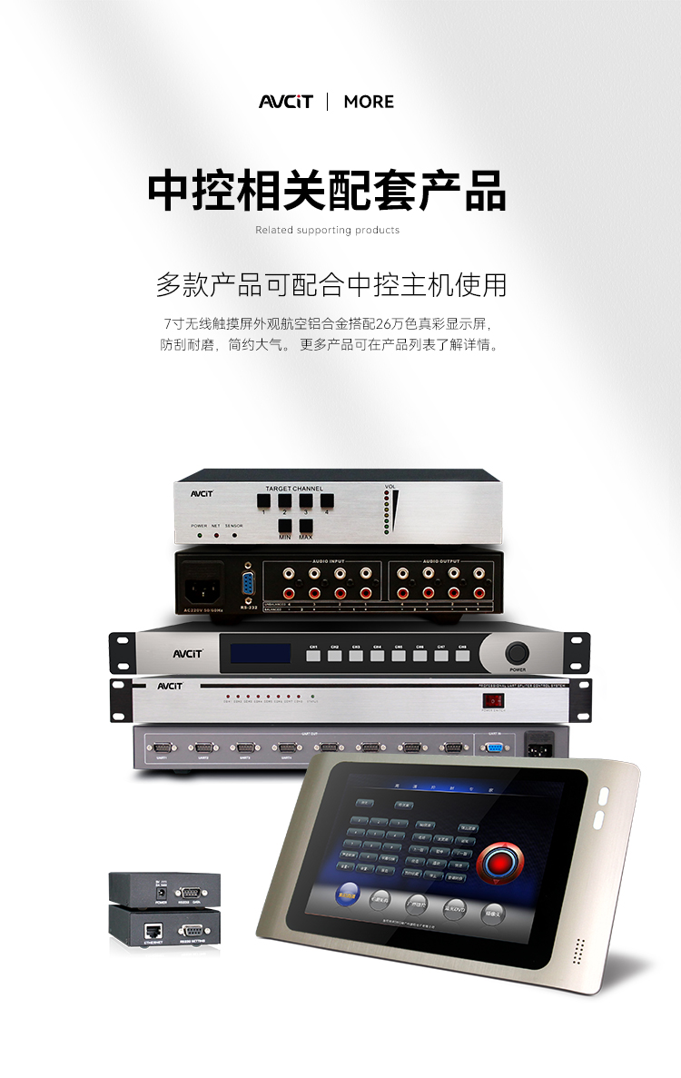 多款產(chǎn)品可配合中控主機(jī)使用,7寸無(wú)線觸摸屏外觀航空鋁合金搭配26萬(wàn)色真彩顯示屏,防刮耐磨,簡(jiǎn)約大氣。 更多產(chǎn)品可在產(chǎn)品列表了解詳情。