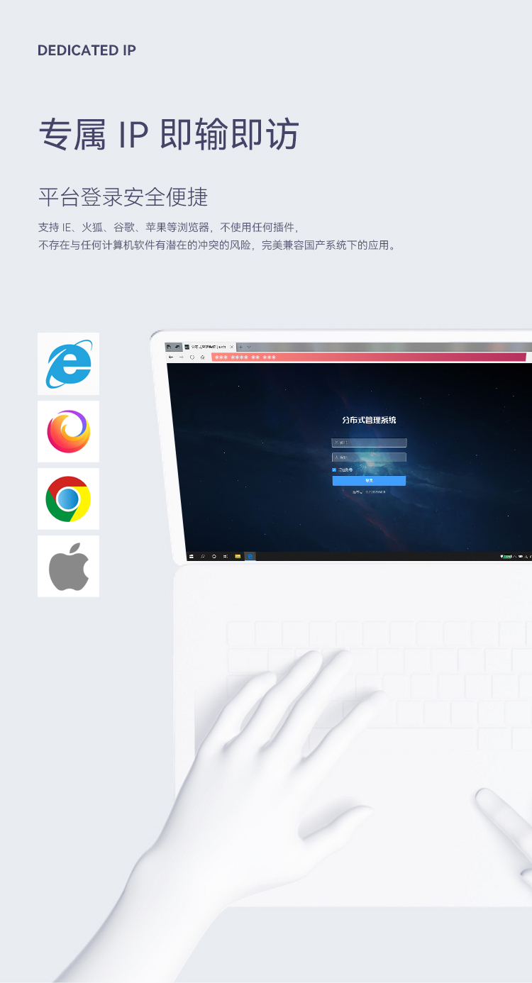 支持 IE、火狐、谷歌、蘋果等瀏覽器,不使用任何插件,不存在與任何計算機軟件有潛在的沖突的風險,完美兼容國產系統下的應用。