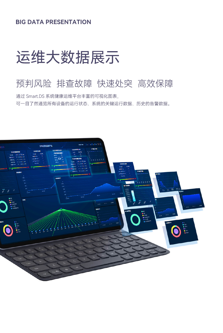 通過 Smart.DS 系統健康運維平臺豐富的可視化圖表,可一目了然通覽所有設備的運行狀態、系統的關鍵運行數據、歷史的告警數據。