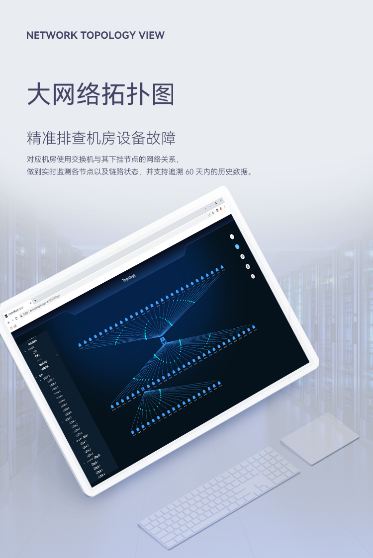 對應機房使用交換機與其下掛節點的網絡關系,做到實時監測各節點以及鏈路狀態,并支持追溯 60 天內的歷史數據。