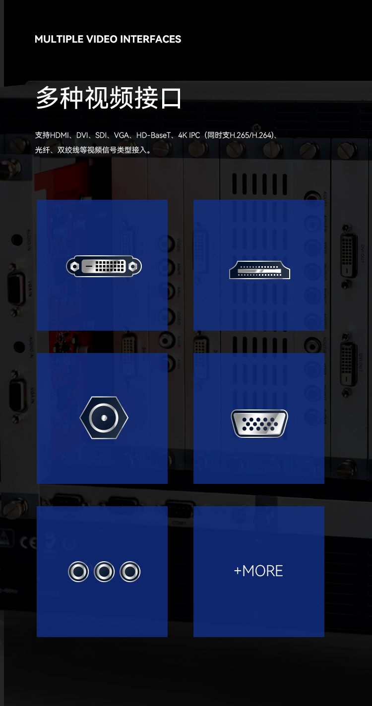 支持HDMI、DVI、SDI、VGA、HD-BaseT、4K IPC(同時(shí)支H.265/H.264)、光纖、雙絞線等視頻信號(hào)類型接入。