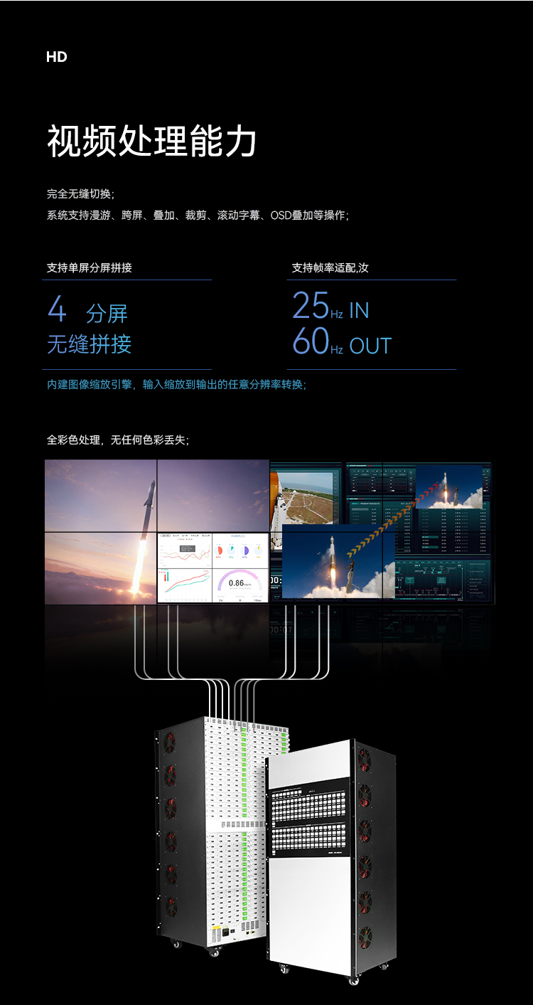 支持單屏4分屏拼接;系統(tǒng)支持漫游、跨屏、疊加、裁剪、滾動(dòng)字幕、OSD疊加等操作;完全無(wú)縫切換;全彩色處理,無(wú)任何色彩丟失; 支持幀率適配(如輸入25幀輸出60幀),內(nèi)建圖像縮放引擎,輸入縮放到輸出的任意分辨率轉(zhuǎn)換;