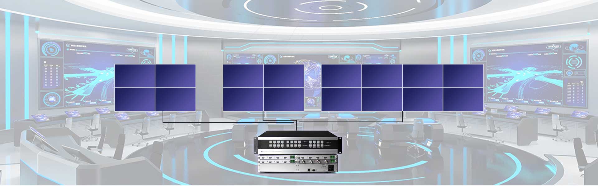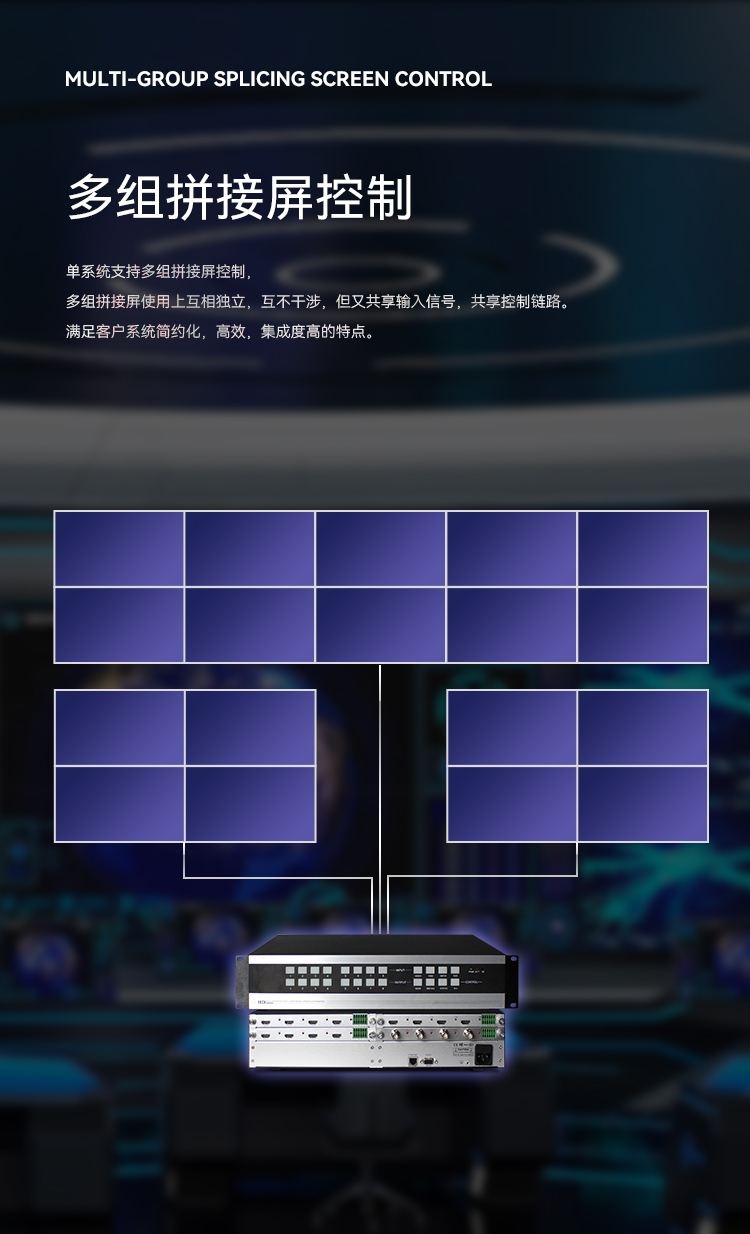單系統(tǒng)支持多組拼接屏控制,多組拼接屏使用上互相獨(dú)立,互不干涉,但又共享輸入信號(hào),共享控制鏈路。滿足客戶系統(tǒng)簡(jiǎn)約化,高效,集成度高的特點(diǎn)。