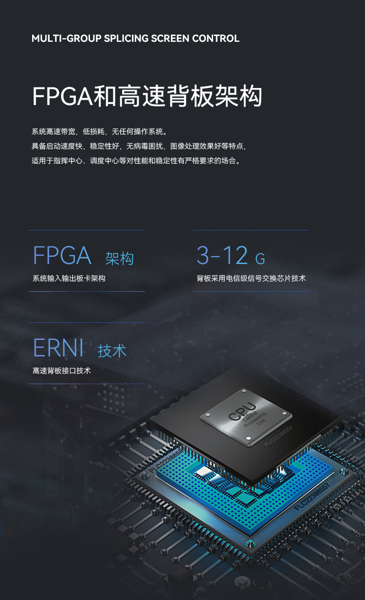 系統(tǒng)采用輸入輸出板卡全FPGA架構(gòu),背板采用電信級(jí)3-12G信號(hào)交換芯片技術(shù),以及德國(guó)ERNI高速背板接口技術(shù),高速高帶寬,低損耗,無(wú)任何操作系統(tǒng)。具備啟動(dòng)速度快,穩(wěn)定性好,無(wú)病毒困擾,圖像處理效果好等特點(diǎn),適用于指揮中心、調(diào)度中心等對(duì)性能和穩(wěn)定性有嚴(yán)格要求的場(chǎng)合。