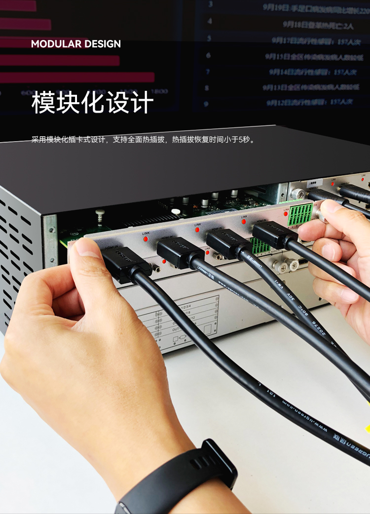 采用模塊化插卡式設(shè)計(jì),支持全面熱插拔,熱插拔恢復(fù)時間小于5秒。