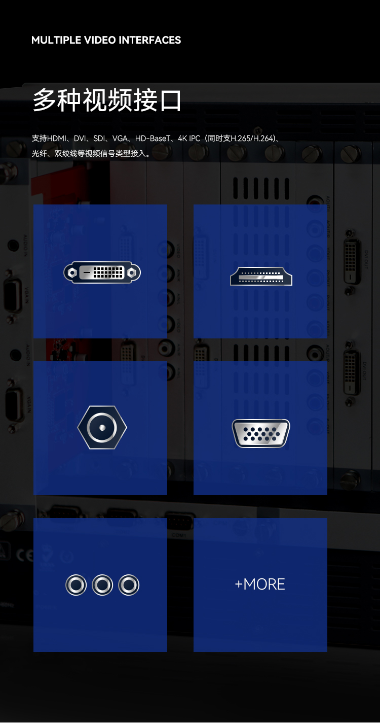 支持HDMI、DVI、SDI、VGA、HD-BaseT、4K IPC(同時支H.265/H.264)、光纖、雙絞線等視頻信號類型接入。