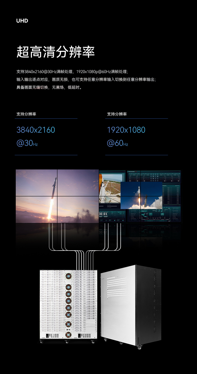 支持3840x2160@30Hz滿幀處理,1920x1080p@60Hz滿幀處理;輸入輸出逐點(diǎn)對應(yīng),畫質(zhì)無損,也可支持任意分辨率輸入切換到任意分辨率輸出;具備畫面無縫切換,無黑場,低延時。