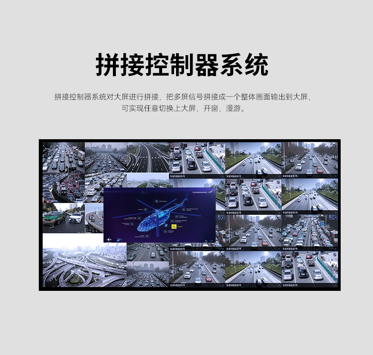拼接控制器系統對大屏進行拼接,把多屏信號拼接成一個整體畫面輸出到大屏,可實現任意切換上大屏,開窗,漫游。