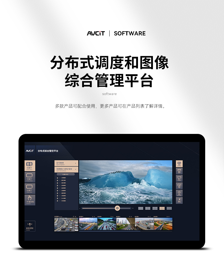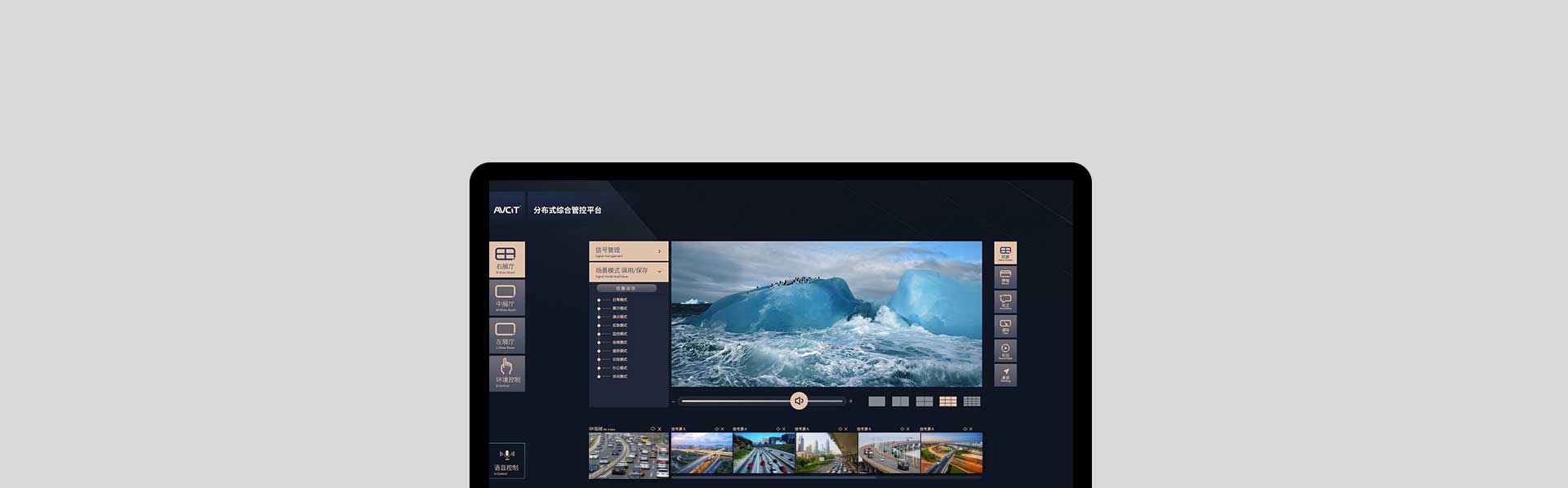分布式調(diào)度和圖像綜合管理平臺是管控與AVCiT分布式系統(tǒng)相關(guān)的軟件,可實現(xiàn)分布式的可視化操控上屏,音視頻信號調(diào)度管理,周邊設(shè)備的集中控制,比如攝像機(jī),電視,燈光等。