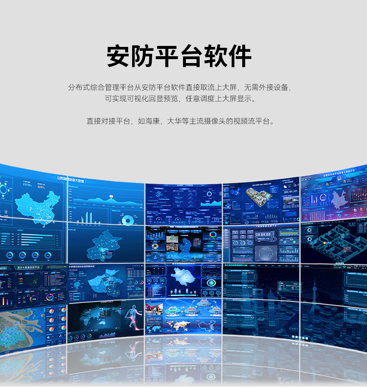 分布式綜合管理平臺從安防平臺軟件直接取流上大屏,無需外接設(shè)備,可實現(xiàn)可視化回顯預(yù)覽,任意調(diào)度上大屏顯示。