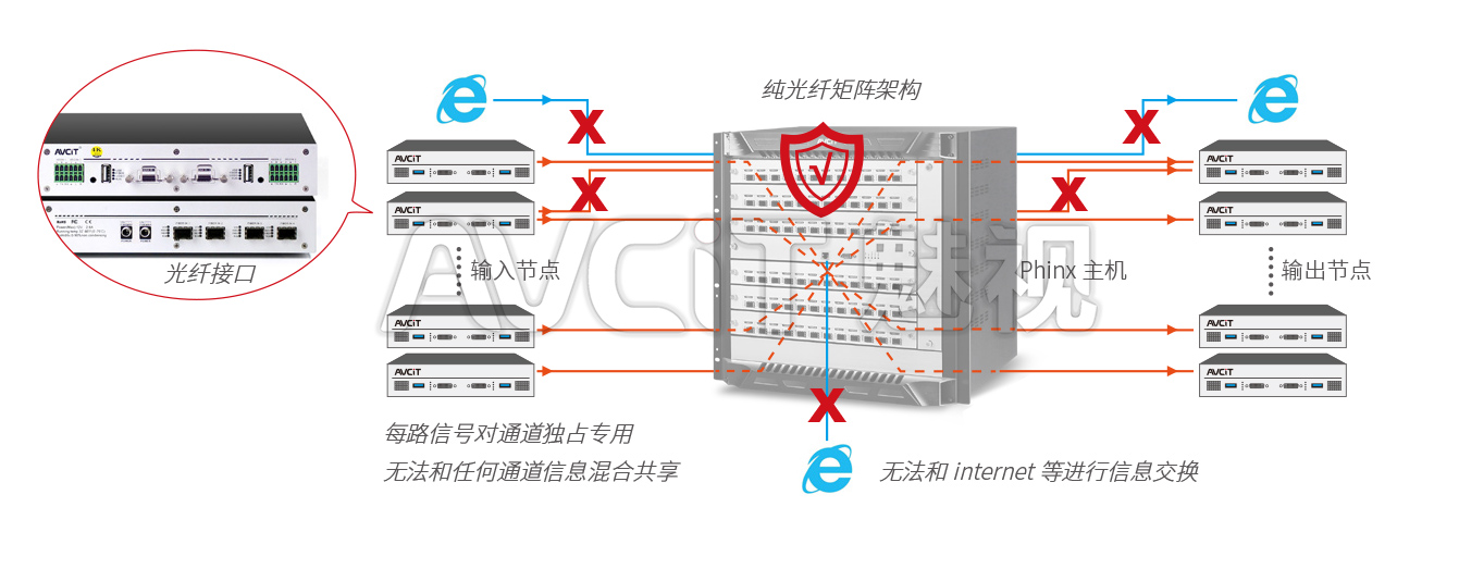 ![]() | 安全可靠為確保控制中心系統(tǒng)更安全可靠,Phinx 系統(tǒng)采用純光纖矩陣架構(gòu),每路信號(hào)對(duì)通道獨(dú)占專用,而非基于數(shù)據(jù)包交換。任何情況下不會(huì)導(dǎo)致?lián)砣G包的可能,更不會(huì)因數(shù)據(jù)量過(guò)大導(dǎo)致交換網(wǎng)絡(luò)癱瘓,數(shù)據(jù)傳輸更可靠;因?yàn)椴皇遣捎冒粨Q技術(shù),從而無(wú)法和任何通道信息混合共享,也無(wú)法和 internet 等進(jìn)行信息交換,確保信息安全。 |