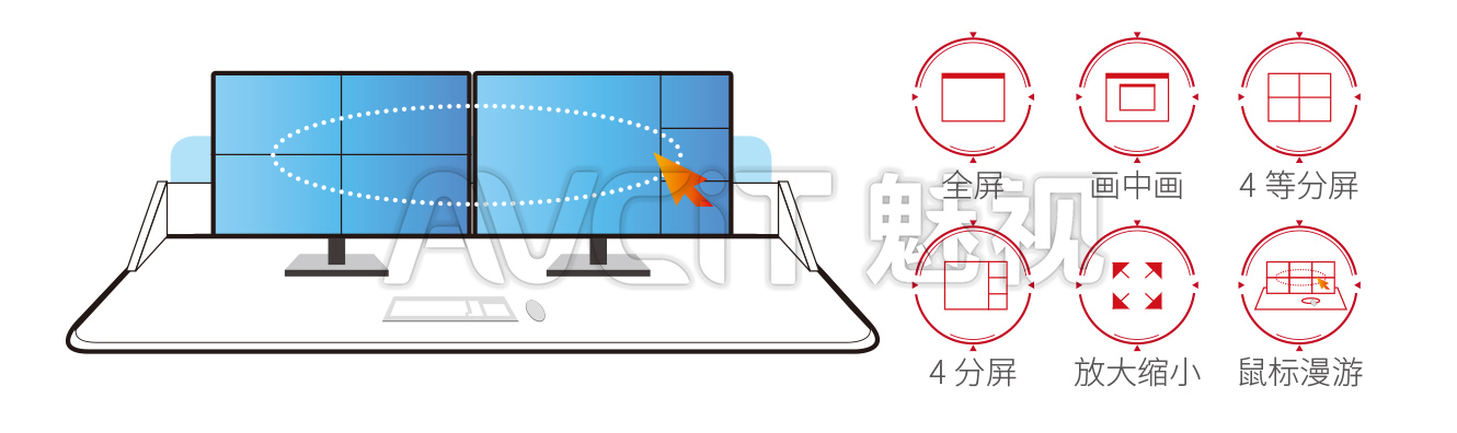 根據(jù)業(yè)務(wù)需求,Phinx系統(tǒng)可進(jìn)行 4 等分、1 大 3 小或者客戶特定需求的分屏。4 等分屏幕上接管的工作站可直接操作,也可投屏到主控屏幕操作,簡(jiǎn)化操作員桌面,節(jié)省投資。 |